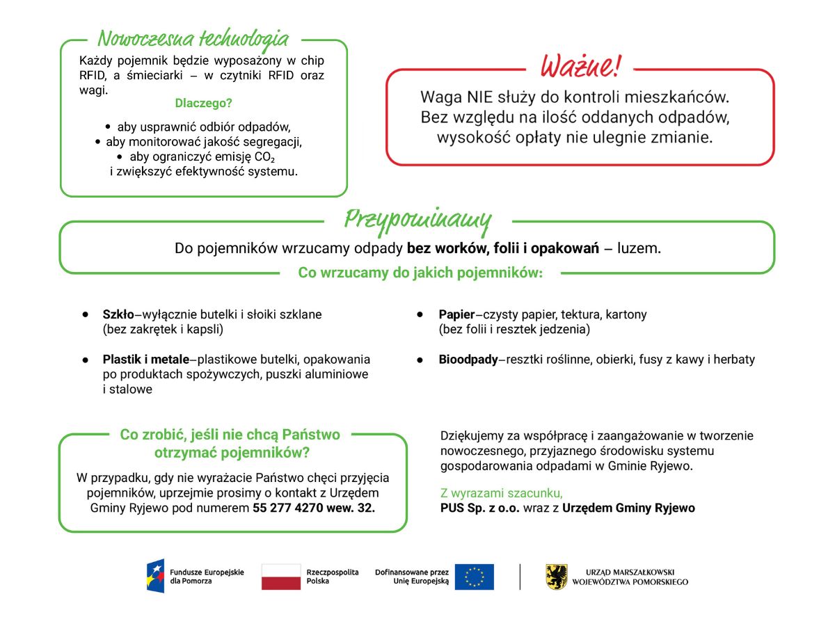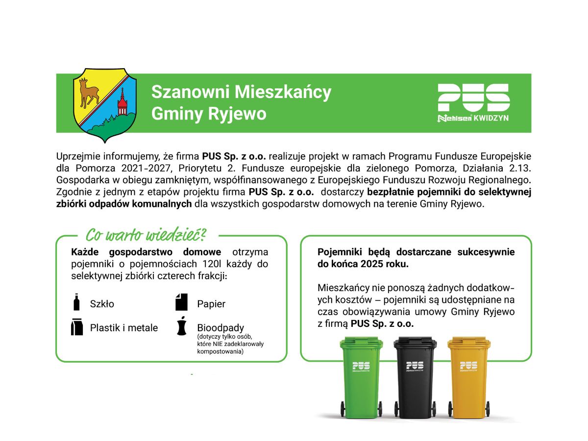 Uprzejmie informujemy, że w ramach realizowanego projektu unijnego, firma PUS Sp. z o.o. rozpoczyna dystrybucję bezpłatnych pojemników do selektywnej zbiórki odpadów komunalnych. Zestawy pojemników trafią do wszystkich gospodarstw domowych na terenie naszej gminy.